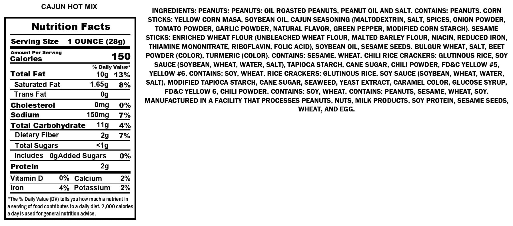 Sprinkle some Cajun seasoning into your life. This mix is not for the faint-hearted so you better like it hot! Cajun Hot Corn Sticks, Sesame Sticks, Chili Rice Crackers, Mixed Rice Crackers, and Spicy Peanuts.Details