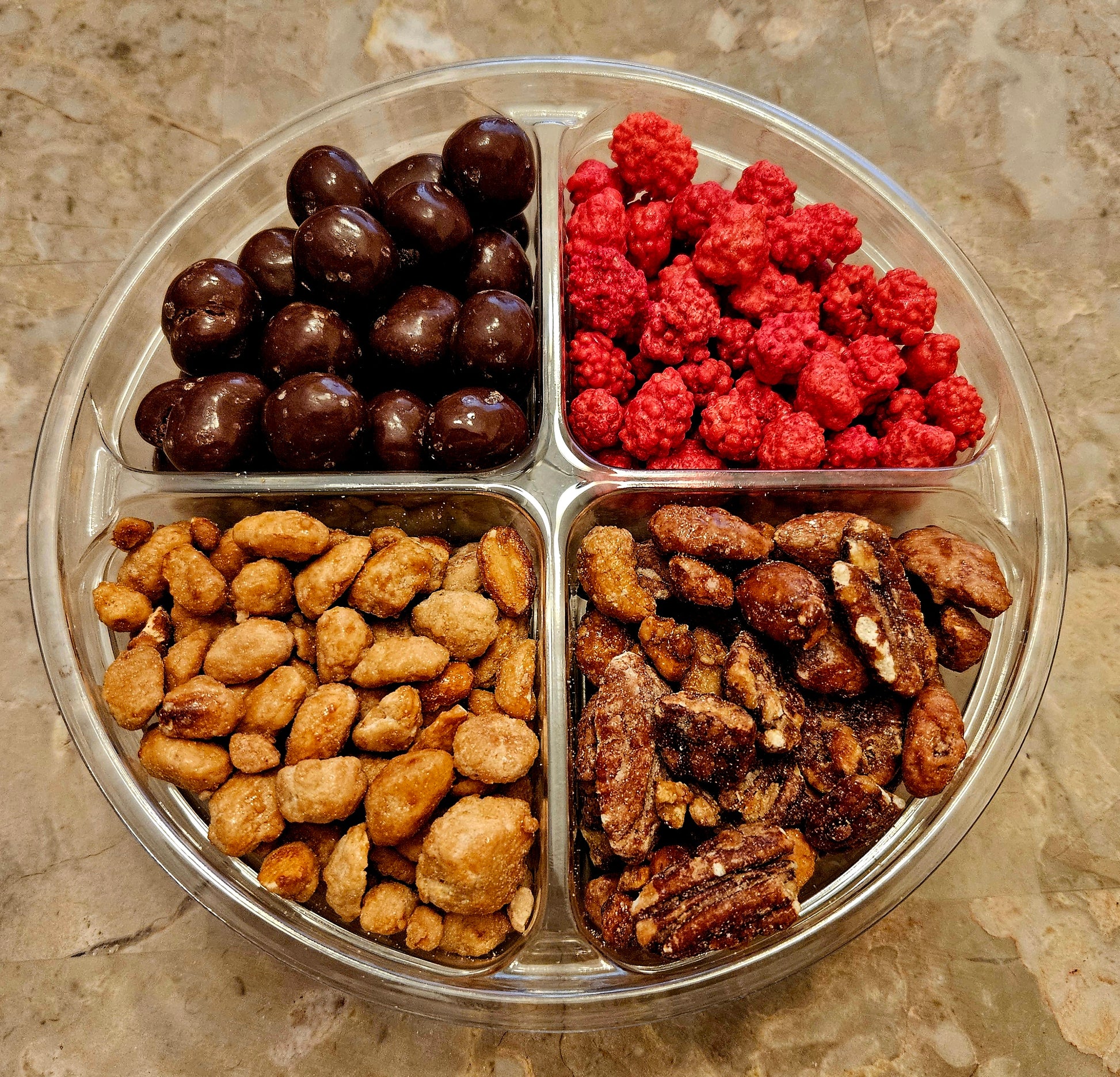 Milk Chocolate Caramels, French Burnt Peanuts, Butter Toffee Peanuts, and Caramelized Mixed Nuts