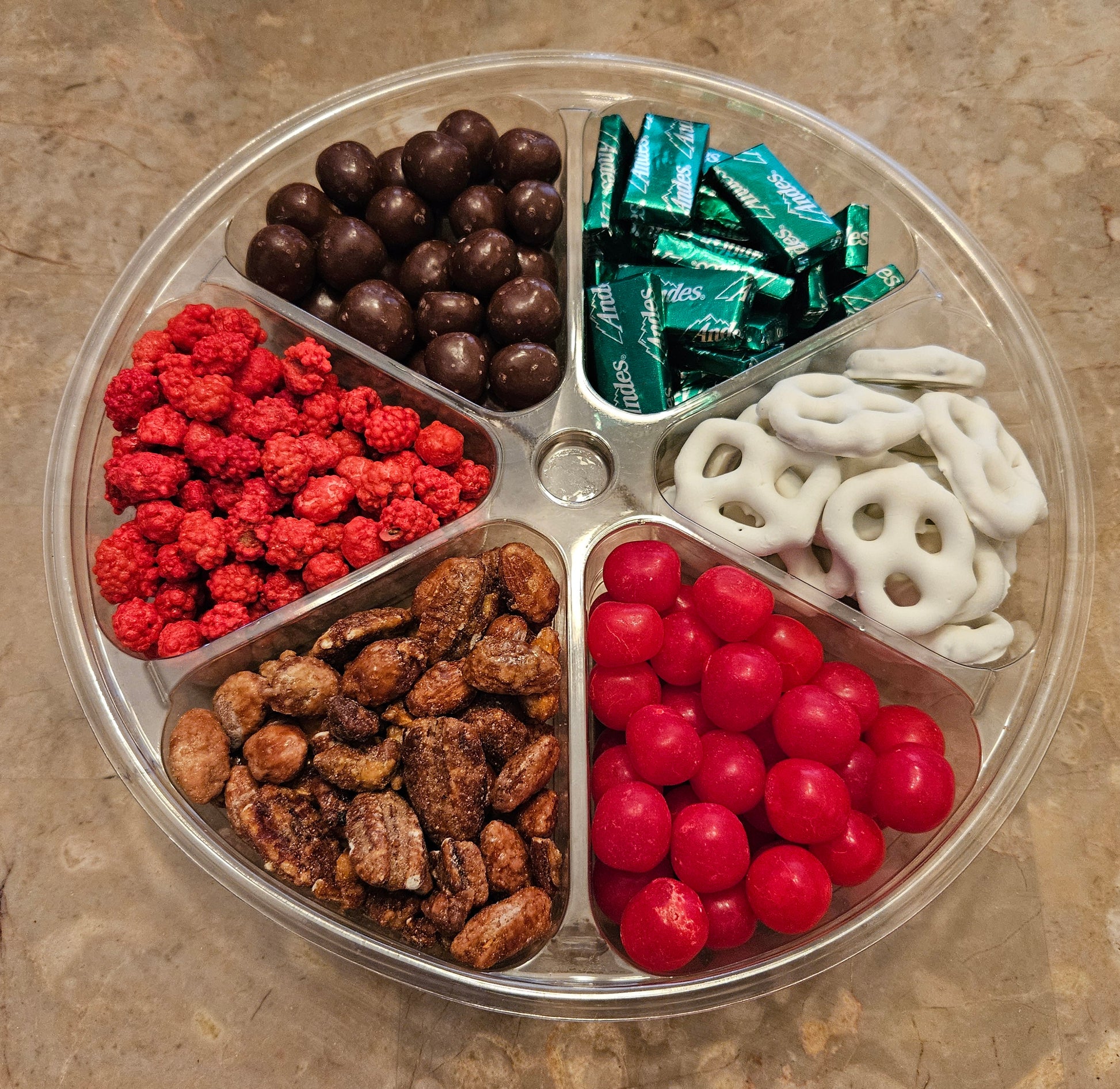 Milk Chocolate Caramels, Andes Mints, Yogurt Pretzels, Cherry Sours, Caramelized Mixed Nuts, and French Burnt Peanuts
