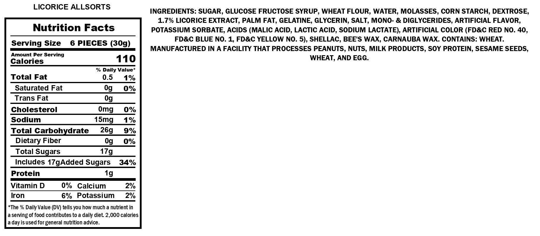 Chewy licorice candies in a mixture of various shapes, sizes and colors. Legend has it that a salesman for a licorice company accidentally dropped a couple bags of various licorice, Intrigued, he created a mix that is still super popular today.